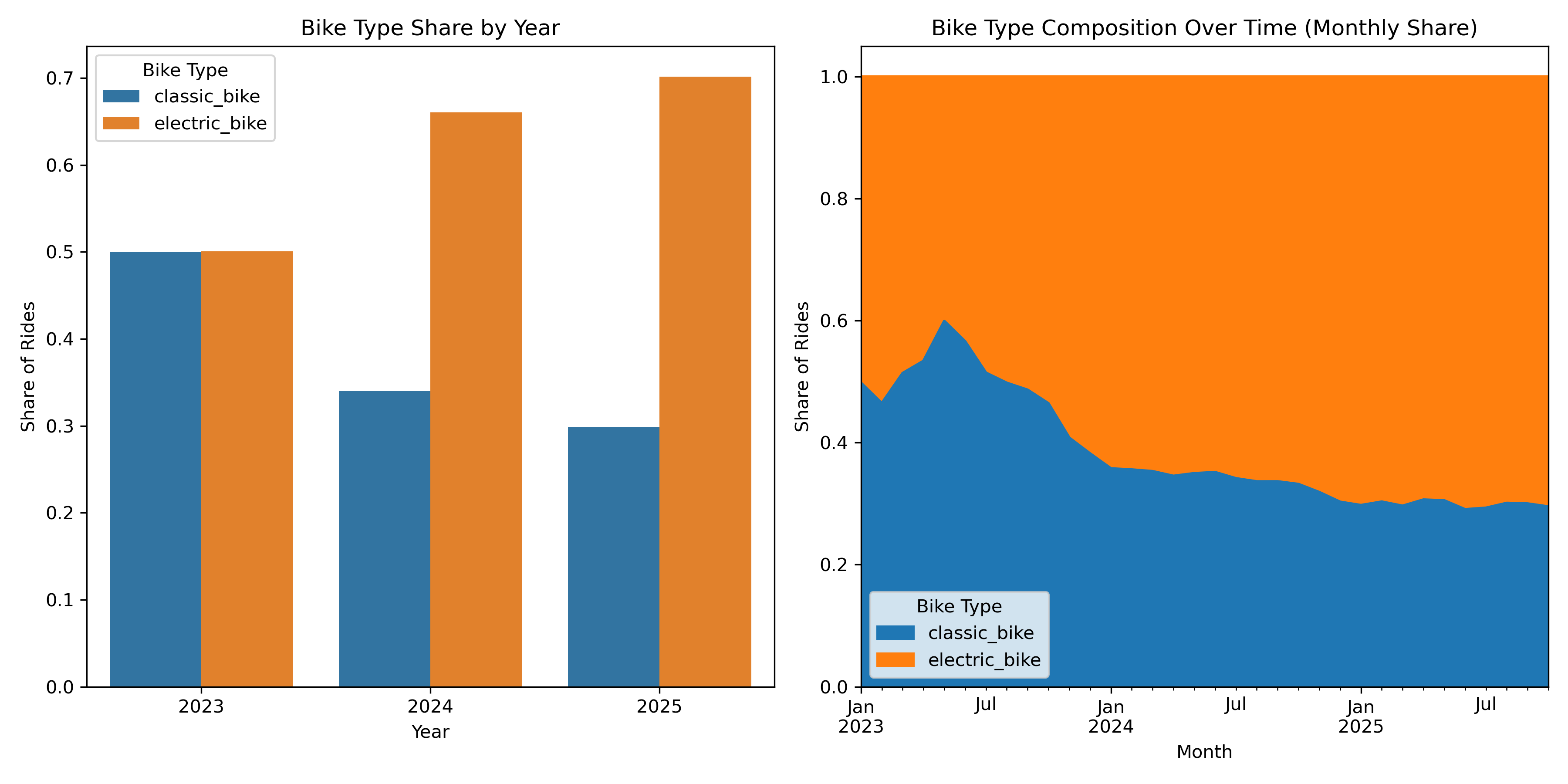 - Usage patterns (bike type, membership, weekday/weekend, hourly) are stable across years.
