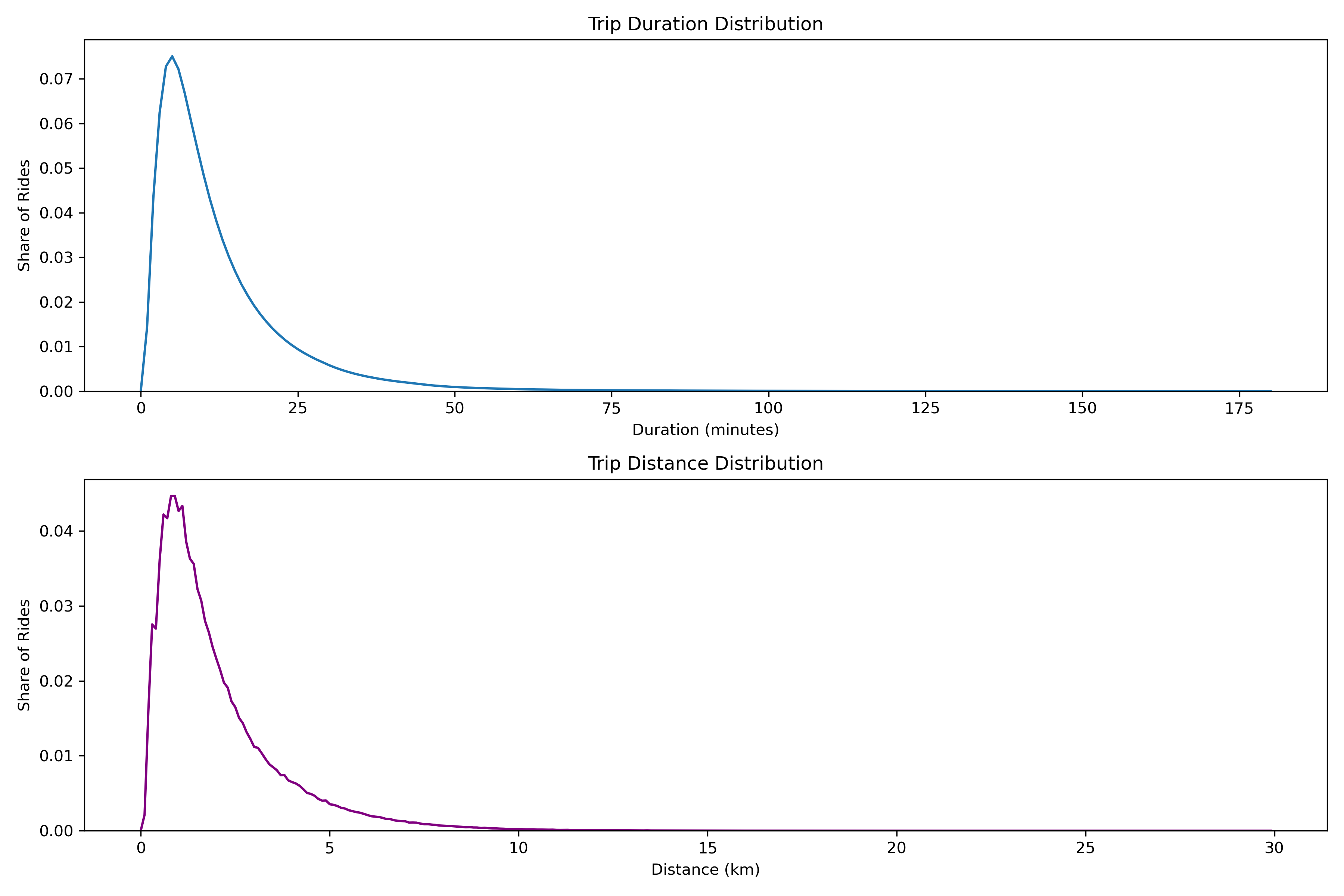 - Trip durations and distances are tightly concentrated -> short urban trips dominate.