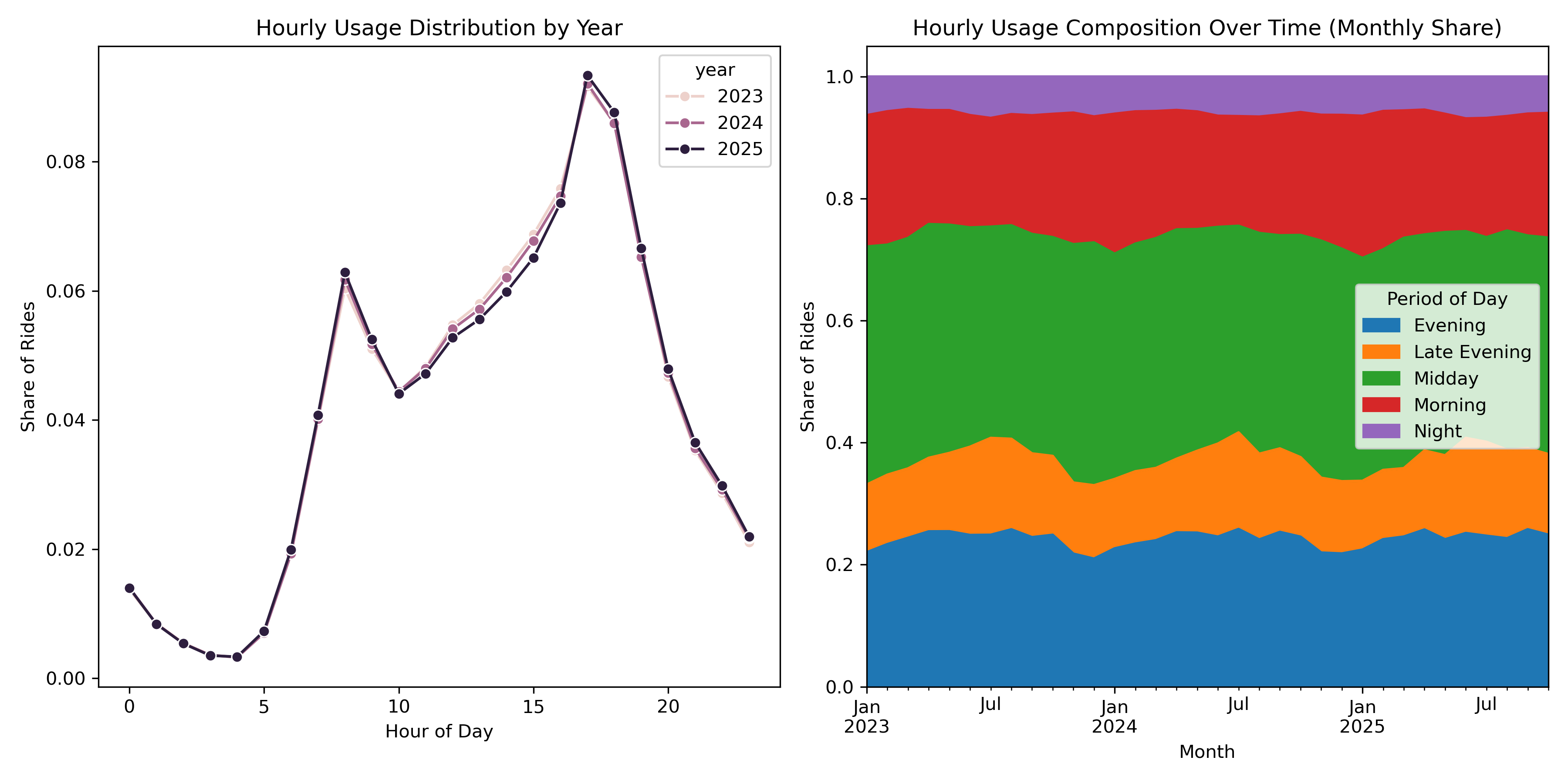 - Highly structured usage: stable weekday dominance, time-of-day commuter peaks, and short trip lengths.
