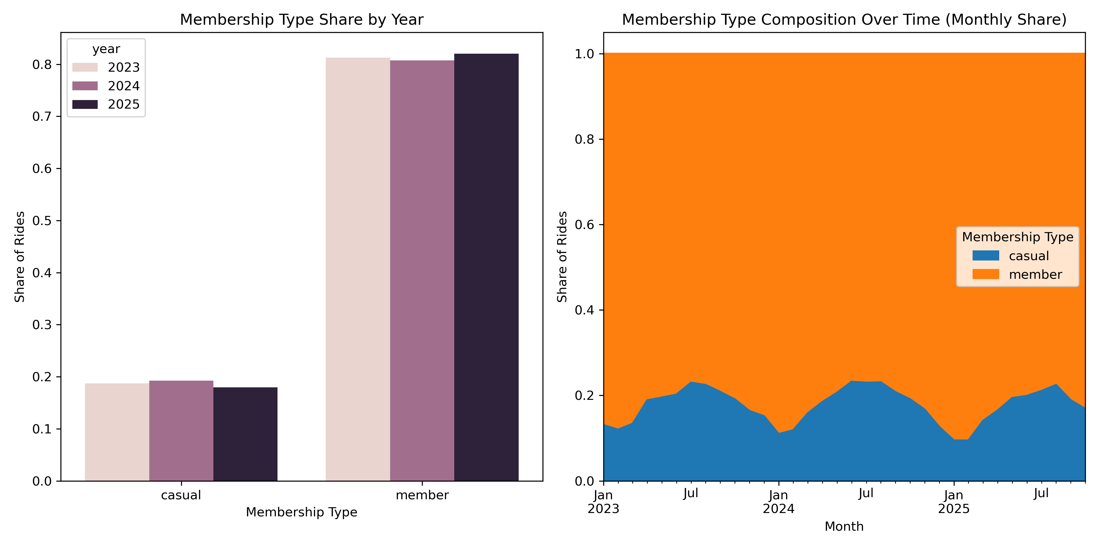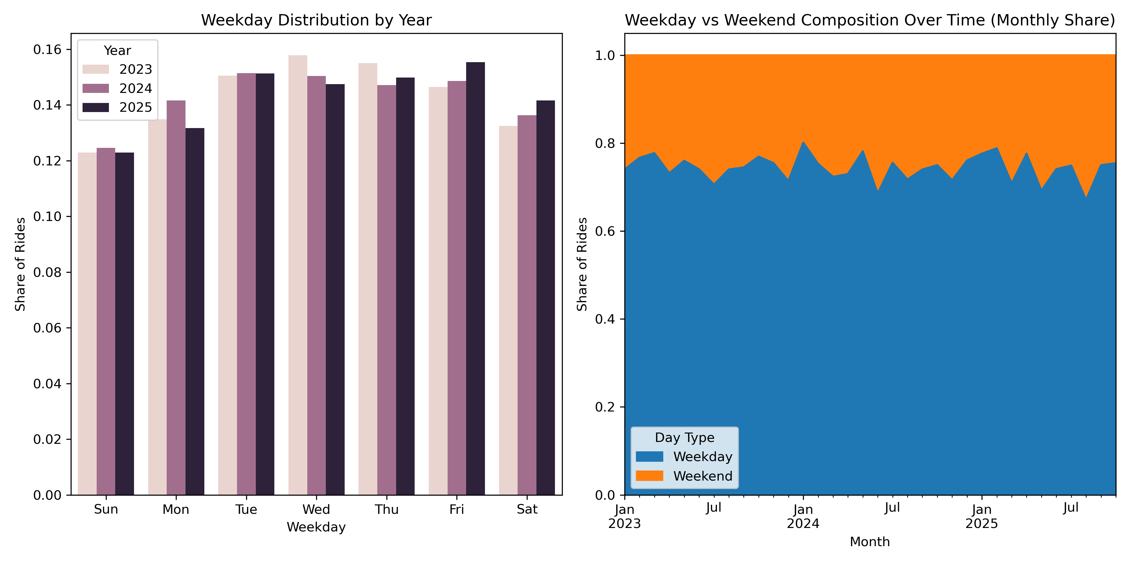 - The member/casual ratio shows no year-to-year change: composition is structurally stable.