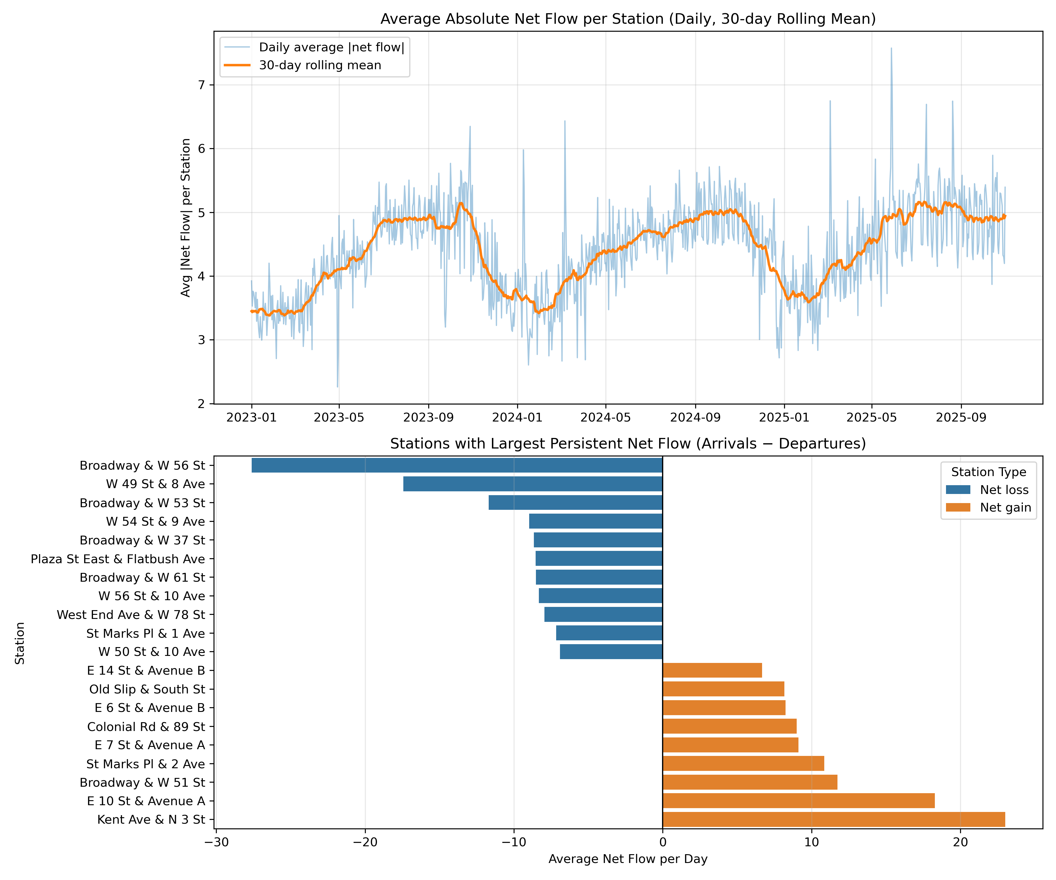 - Net flow imbalances are structural and predictable, concentrated in a small set of stations.