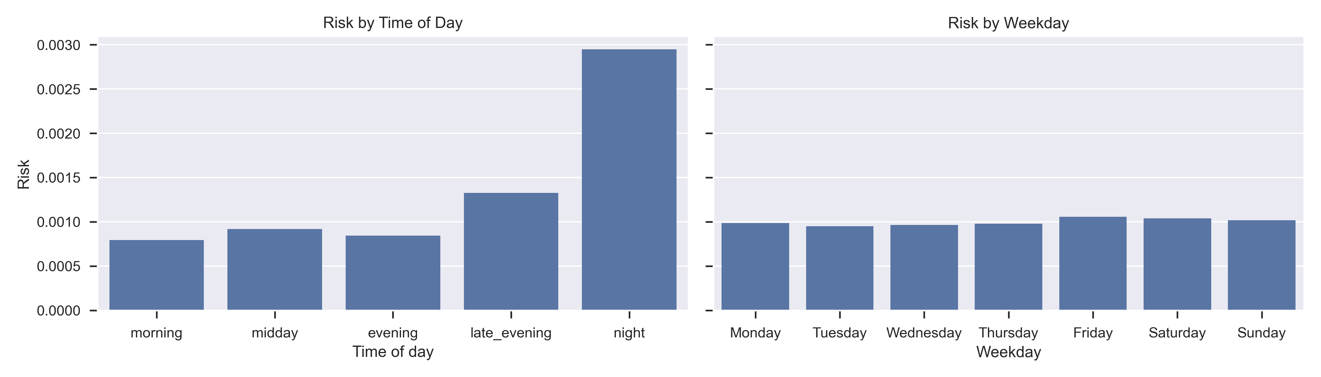 - Temporal risk: Time-of-day dominates weekday differences: late evening and night show 1.5*-4* higher risk than daytime; weekday patterns are nearly identical.